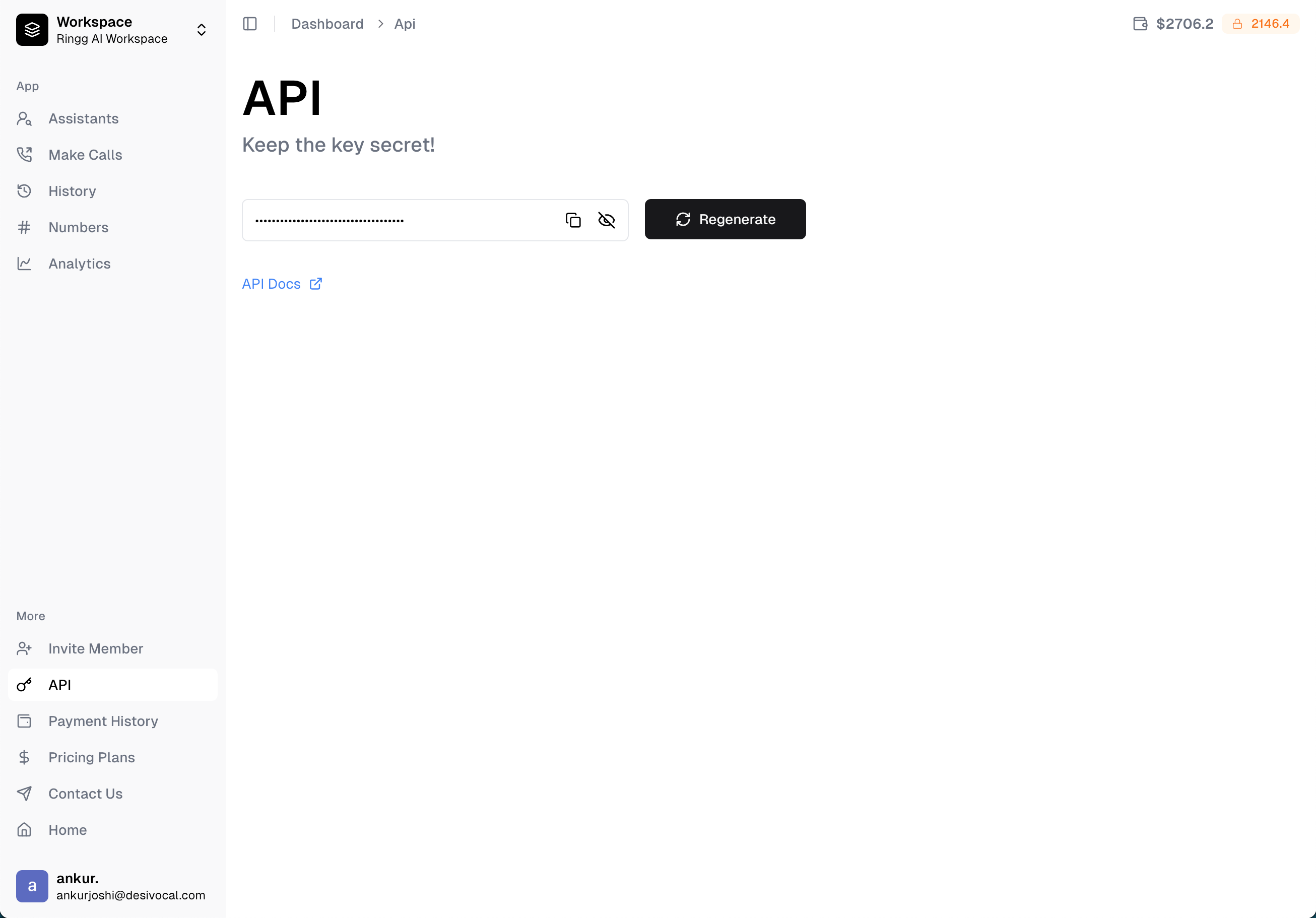 To use the Ringg AI API, you’ll need an API key (X-API-KEY):